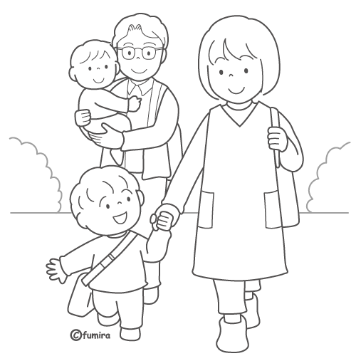 トップページクリップアート家族や親子のイラスト2>散歩をする家族のイラスト(ぬりえ)